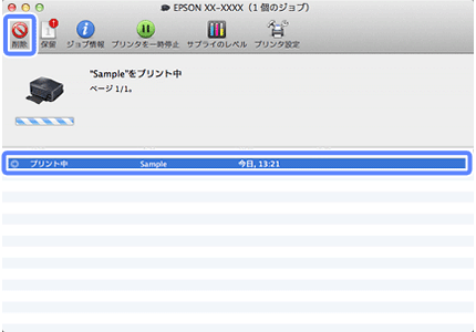 印刷中に[Dock]内の[プリンタ]アイコンをクリックすると、印刷状況を確認できる画面が表示されます。印刷データをクリックして[