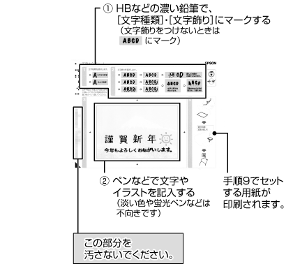 メモリーカード内の写真を選択して手書き合成シートを印刷し、文字やイラストを記入してスキャンすると、その文字やイラストが入った写真が印刷できます。