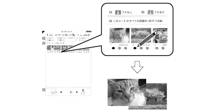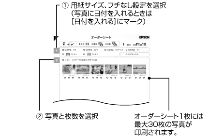 写真を一覧できるオーダーシートを印刷し、マークを付けてスキャンすると、マークした写真だけを印刷できます。