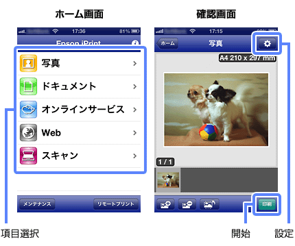 「Epson iPrint」を起動して、ホーム画面で使いたい項目を選択します。