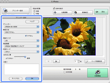 本製品に付属の「E-Photo」などカラリオかんたんプリント対応ソフトウェアでは、プリンタードライバーの画面で詳細な印刷設定をしなくても、簡単にきれいに印刷できます。