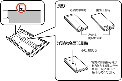 長形封筒をセットするときは、トレイ先端の三角マークに合わせてセットし、左右と手前の用紙ガイドを合わせます。