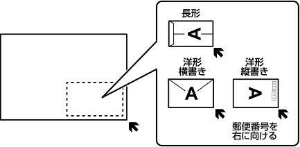宛名面を下にして、原稿台にセットしてください。封筒をセットする場合は図の向きで封筒を置いてください。