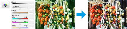 明るさとコントラスト(明暗の差)を調整し、シアン、マゼンタ、イエローのカラーバランスを調整することで、画像を適切な色合いに補正できます。