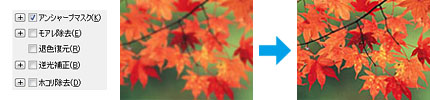 アンシャープマスクの度合いを調整して輪郭部分を強調することで、画像をシャープに補正できます。