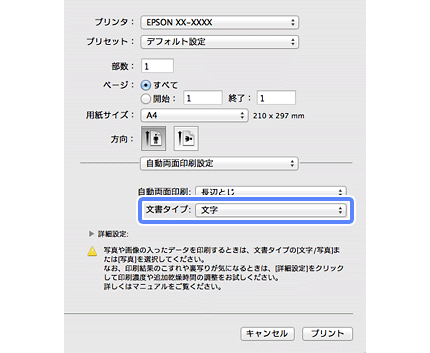 写真やグラフなど濃度の高いデータを印刷するときは、[文書タイプ]の[文字/写真]または[写真]を選択してください。それでも印刷結果のこすれや裏写りが気になるときは、[詳細設定]左横ので印刷濃度や追加乾燥時間の調整をお勧めします。