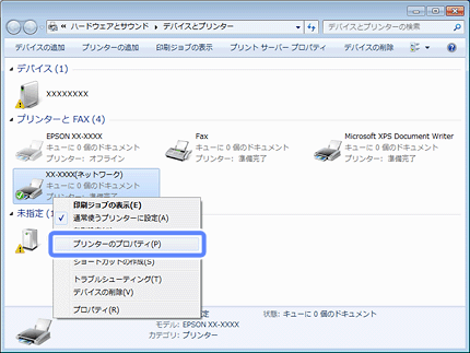 Windows 7: [スタート]-[コントロールパネル]-[ハードウェアとサウンド]の[デバイスとプリンターの表示]の順にクリックしてください。