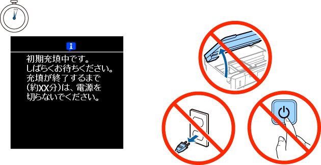 ボタンを押すとインク充填が始まります。充填中でも次の作業に進めます。充填が終了するまで待つ必要はありません。