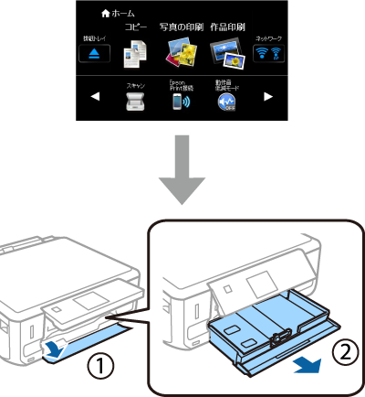 1 ホーム画面が表示されていることを確認します。前面カバーを開けて、下トレイを引き抜きます。