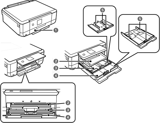 印刷用紙をセットします。 エプソンの スマートフォンアプリで印刷するときは、上トレイは[用紙カセット1]、下トレイは[用紙カセット2]を給紙装置で選択してください。 |