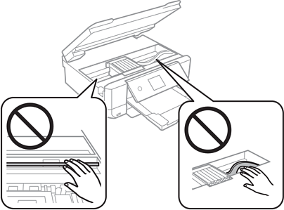 内部に手を入れるときは、操作パネルのボタンには触らないでください。プリンターが動作してけがをするおそれがあります。また、突起などでけがをしないように注意してください。