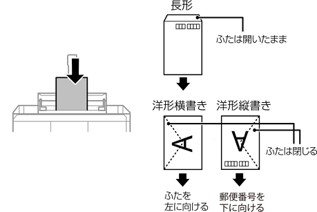 長形封筒をセットするときは、トレイ先端の三角マークに合わせてセットし、左右と手前の用紙ガイドを合わせます。