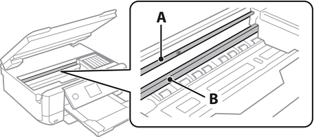 レール部(B)に触れないように注意してください。印刷できなくなることがあります。潤滑油が付いていますが、構造上必要なので拭き取らないでください。