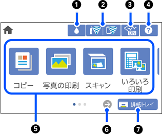 [ヘルプ]画面を表示します。困ったときの対処方法やプリンターの基本操作手順が確認できます。 また、プリンターが故障したときは、「お客様診断シート(3枚)」を印刷し、1枚目と2枚目に必要事項を記入してください。3枚目のノズルチェック結果と共にプリンターに添付すると、修理がスムーズです。 |
