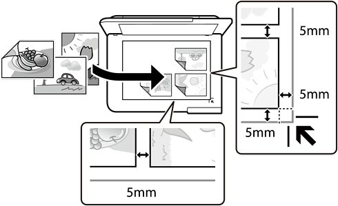 • 原稿台の端から約5mm以上離して置いてください。複数の写真や、サイズが異なる写真も同時に置けます。