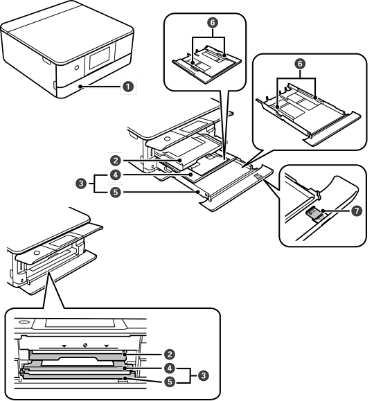 印刷用紙をセットします。 エプソンのスマートフォンアプリで印刷するときは、上トレイは[用紙カセット1]、下トレイは[用紙カセット2]を給紙装置で選択してください。 |