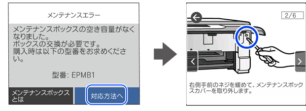 以下の画面が表示されたときは、お客様による交換はできません。エプソンの修理窓口に交換をご依頼ください。