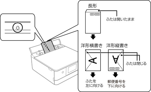 印刷する面を下にして、図の矢印の向きで用紙トレイの奥に突き当ててセットします。その後用紙ガイドを封筒の側面に合わせてください。