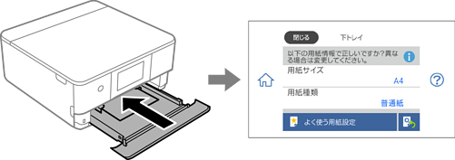 用紙トレイ挿入時にプリンターに表示される画面で、必ず用紙サイズと種類を登録してください。登録情報と印刷設定が異なるときにプリンターがお知らせします。サイズを間違って印刷してしまったり、用紙種類に合った印刷ができず色味が変わってしまったりすることを防ぎ、用紙やインクを無駄にせずに済みます。