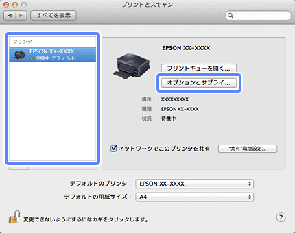ご使用のプリンターを選択して、[オプションとサプライ]をクリックします。