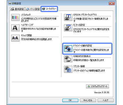 [ユーティリティー]タブをクリックして、[ドライバーの動作設定]をクリックします。