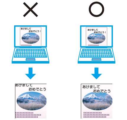 フチなし印刷は、データを少し拡大してはみ出させて印刷することで、フチのない印刷を実現しています。そのため、文字を用紙の端ぎりぎりに配置すると、文字が切れる可能性があります。文字は用紙端から少し離して配置することをお勧めします。