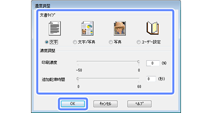写真やグラフなど濃度の高いデータを印刷するときは、[文書タイプ]の[文字/写真]または[写真]を選択してください。それでも印刷結果のこすれや裏写りが気になるときは、[詳細設定]左横ので印刷濃度や追加乾燥時間の調整をお勧めします。