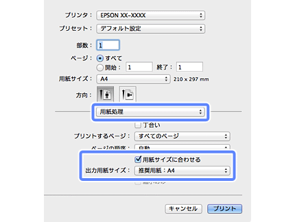 [用紙処理]メニューを選択し、[用紙サイズに合わせる]をチェックして、[出力用紙サイズ]でプリンターにセットした用紙サイズを選択します。