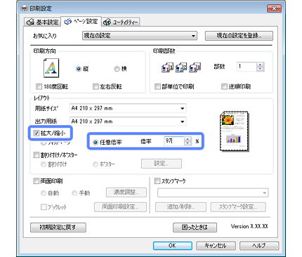 印刷データを自動または任意の倍率で拡大/縮小して印刷できます。