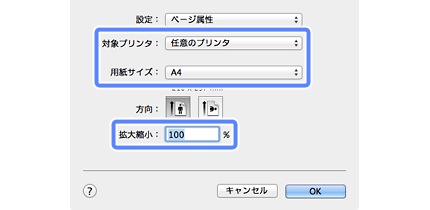 [対象プリンタ]/[用紙サイズ]を選択して、[拡大縮小]に倍率を入力します。