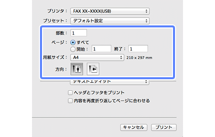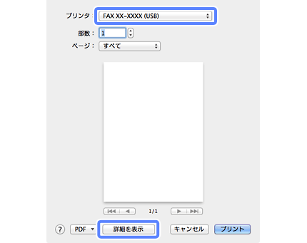 [プリンタ]で[FAX XX-XXXX](ご使用のプリンター名)を選択し、画面下側の[詳細を表示](または[プリンタ]右横の