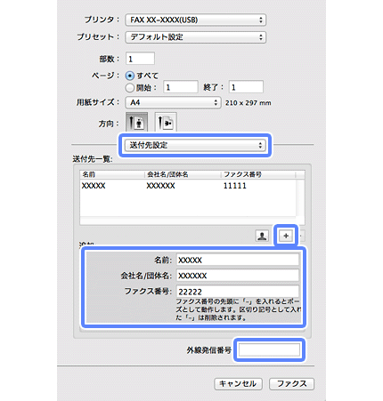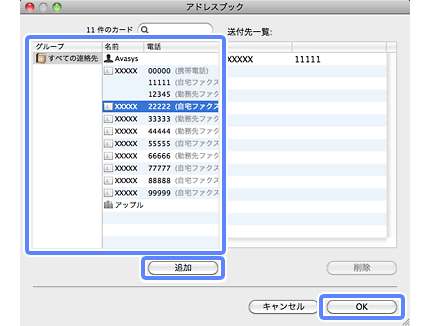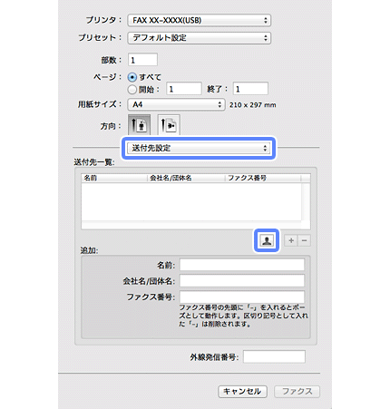 Mac OS Xに付属のアドレスブックから送付先(名前/ファクス番号など)を選択する場合