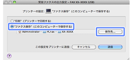 ["ファクス保存"(このコンピューターで保存する)]を選択し、[保存先...]をクリックして受信ファクスデータを保存するフォルダーを指定します。