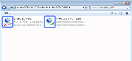 Windows 7: [スタート]-[コントロールパネル]-[ネットワークとインターネット]-[ネットワークと共有センター]-[アダプターの設定の変更]の順にクリックしてください。
