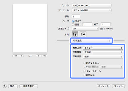 用紙をセットした給紙装置を選択します。給紙装置が1つしかない機種ではこの項目は表示されません。