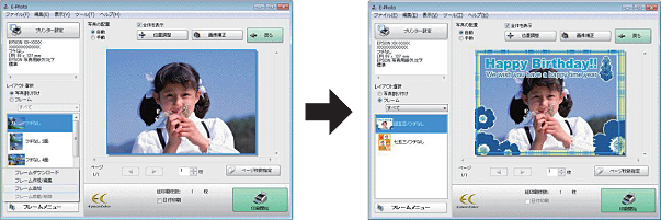 エプソンのホームページには年賀状や挨拶状などのフレームが用意されていますので、ダウンロードしたP.I.F.フレーム*をE-Photoに追加して、簡単できれいにフレーム付き写真を印刷できます。詳しい使い方は、ソフトウェアのヘルプをご覧ください。