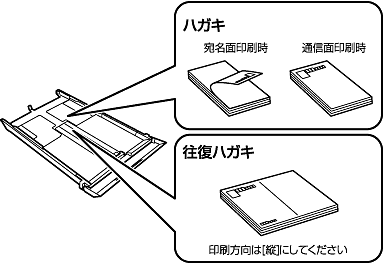 慶弔用ハガキや写真店などでプリントした(写真を貼り合わせた)ハガキなど、厚手のハガキは用紙トレイにはセットできません。手差し給紙にセットしてください。