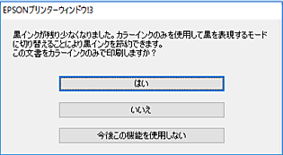 黒インクで黒を印刷します。以降、黒インクカートリッジを交換し、再び残量が少なくなるまでこの画面は表示されません。 |