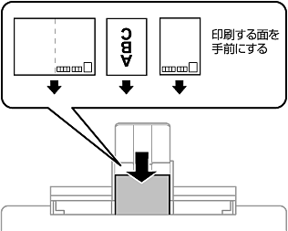 手差し給紙にセットするときは、印刷する面を手前にして中央にセットし、用紙ガイドをハガキの側面に合わせてください。