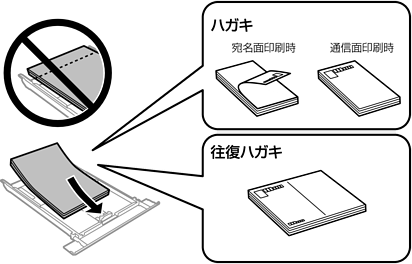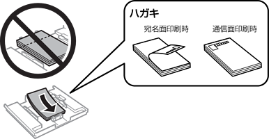 下トレイにセットするときは、印刷する面を下にして、図の矢印の向きで下トレイの奥に突き当ててセットします。その後用紙ガイドをハガキの側面に合わせてください。