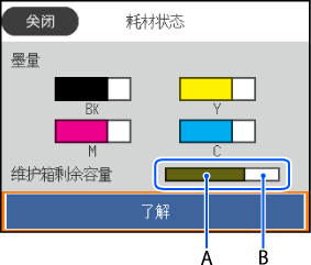 您可以通过本产品的操作面板检查大致墨量及维护箱的大致使用寿命。在主界面上选择