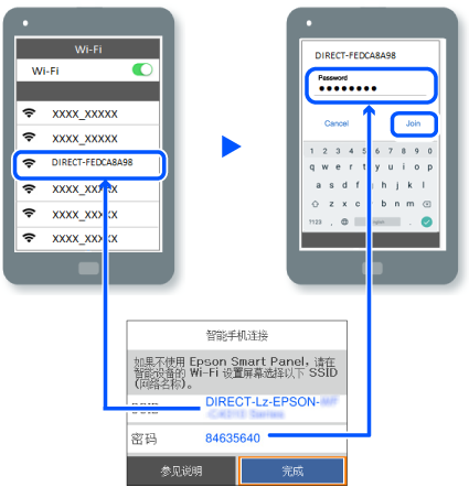 4 在智能设备的 Wi-Fi 屏幕中,选择打印机控制面板上展示的 SSID,然后输入密码。
