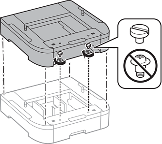 הורד את המדפסת בעדינות על מחסנית הנייר האופציונלית תוך יישור הפינות בקו אחד, וחבר אותן באמצעות הברגים.