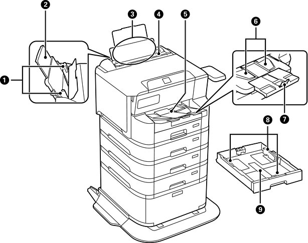 Menampung kertas yang dikeluarkan. Saat mencetak menggunakan kertas di atas A4, tarik ekstensi yang ada di ujung baki dengan tangan dan naikkan penghenti agar kertas tidak jatuh. Simpan setelah digunakan. |