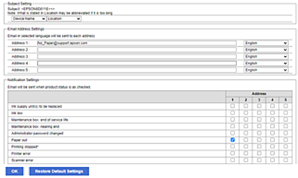 Jika anda ingin pemberitahuan dihantar ke alamat e-mel yang ditetapkan untuk nombor 1 dalam Email Address Settings apabila pencetak kehabisan kertas, pilih lajur kotak semak 1 dalam baris Paper out.