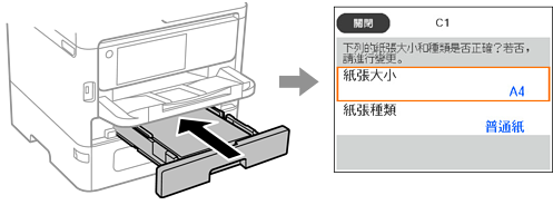 務必在放入紙張後顯示的畫面上登錄紙張大小和種類。當登錄的資訊與列印設定不同時,印表機會通知您。這可確保您不會由於使用不符合紙張類型的設定列印於錯誤紙張大小上或列印錯誤色彩,從而防止紙張和墨水浪費。