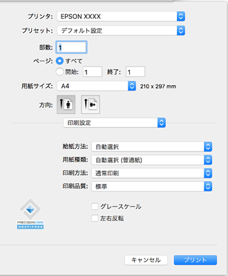 macOS Catalina (10.15)以降、macOS High Sierra (10.13)、macOS Sierra (10.12)、OS X El Capitan (10.11)、OS X Yosemite (10.10)、OS X Mavericks (10.9)で[印刷設定]メニューが表示されないときは、エプソンのプリンタードライバーが設定できていません。以下の方法で設定してください。