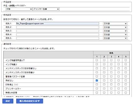 印刷停止やプリンターエラーなどのイベントが発生したときに、指定したアドレスにメールが送信されるようにメール通知を設定できます。宛先は5つまで登録でき、それぞれに受け取りたい通知を設定できます。