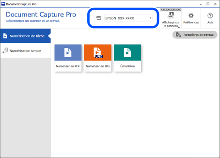 Sélectionnez le scanner que vous souhaitez utiliser dans l’écran supérieur Document Capture Pro. Lorsque vous démarrez le logiciel, il se connecte automatiquement au dernier scanner utilisé.