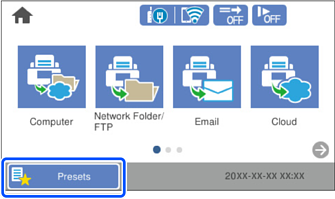 Válassza ki a lapolvasó vezérlőpanelének kezdőképernyőjén a(z) Előbeállítások elemet.